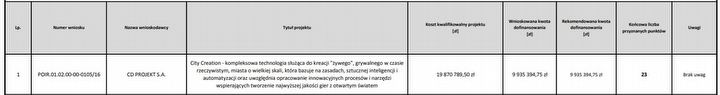 W 2016 roku w ramach opisanego powyżej projektu Narodowe Centrum Badań i Rozwoju dofinansowało 38 projektów polskich twórców gier. Łącznie przeznaczono na ten cel 116 milionów złotych. Najwięcej pieniędzy – bo 28 milionów złotych – otrzymał wówczas właśnie CD Projekt RED, który miał za nie zrealizować 4 projekty:
