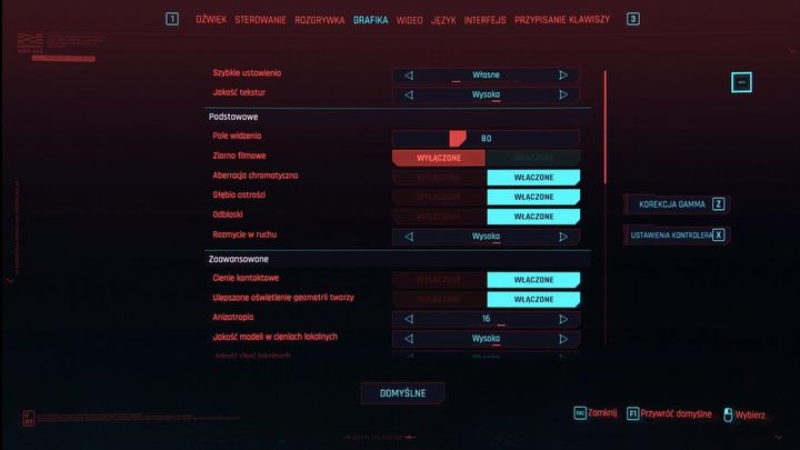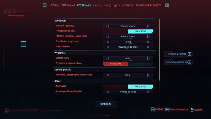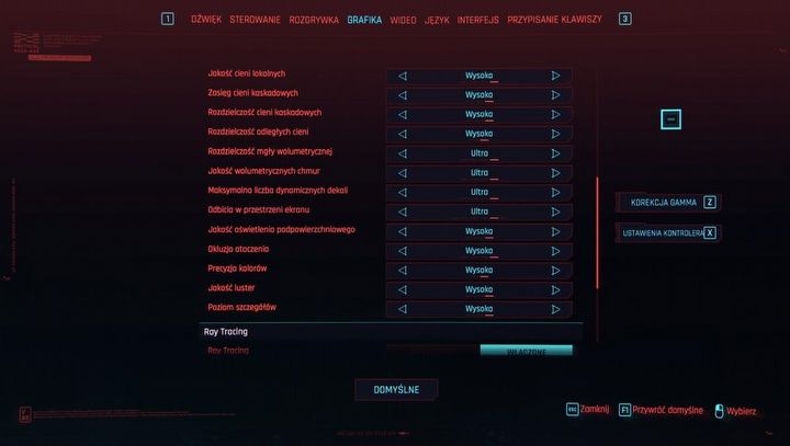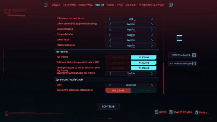 W Cyberpunku 2077 ustawimy jakość m.in. tekstur, oświetlenia, wolumetrycznych chmur czy luster lub zakres pola widzenia. W grze najwięcej jest opcji związanych z cieniami, m.in. kontaktowe, kaskadowe czy odległe. Zgodnie z zapowiedzią, wersja PC może pochwalić się obsługą techniki ray tracingu, która ogranicza się do czterech efektów, które można włączyć lub wyłączyć, albo ustawić odpowiedni stopień jakości (od niskiego do maksymalnego). Naturalnie nie obyło się bez opcji DLSS, która mniejszym lub większym kosztem jakości obrazu poprawia znacząco wydajność. Niezbyt duża liczba NPC-ów w materiałach przedpremierowych wzbudzała u wielu graczy niepokój, ale chcemy Was uspokoić – w Cyberpunku 2077 na PC jest ustawienie odpowiedzialne za gęstość tłumu.