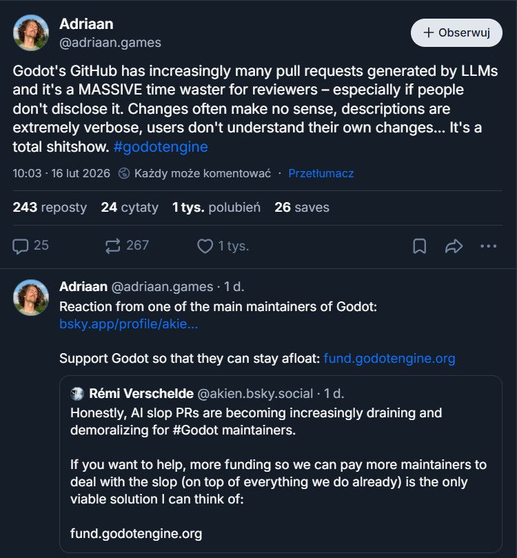 Sztuczna inteligencja może ułatwić codzienną pracę, a nawet pozwolić użytkownikom na wykonywanie zadań, o których nie mają pojęcia. Problem pojawia się wtedy, kiedy przygotowany prompt przestaje dawać odpowiednie rezultaty. Okazuje się, że opiekunowie silnika Godot mierzą się z coraz większą liczbą bezsensownych próśb o zmiany w kodzie napisanych przy użyciu LLM-ów. Ekspertom trudno określić, czy za błędy odpowiada człowiek, czy też sztuczna inteligencja.