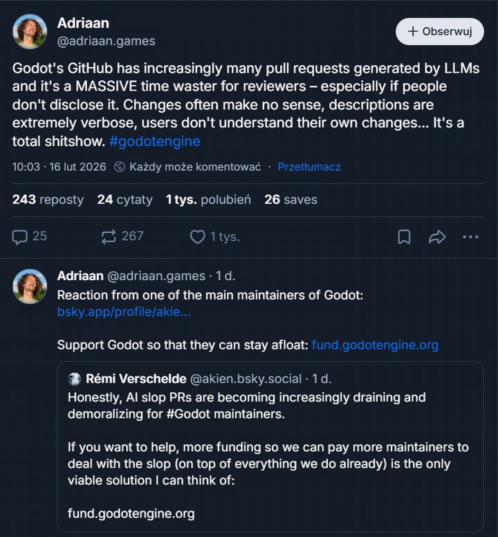 GitHub Godota ma coraz więcej próśb o zmiany generowane przez LLM-y i jest to ogromna strata czasu dla recenzentów – szczególnie jeśli ludzie tego nie ujawniają. Zmiany często nie mają sensu, opisy są niezwykle rozwlekłe, użytkownicy nie rozumieją własnych zmian... To kompletna porażka – wtóruje Verscheldemu Adriaan de Jongh, współtwórca gry logicznej Hidden Folks.