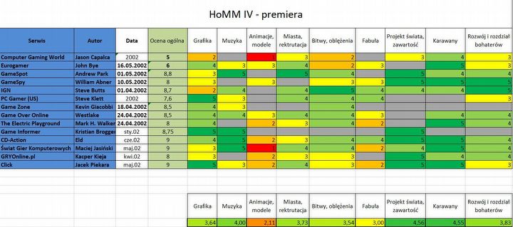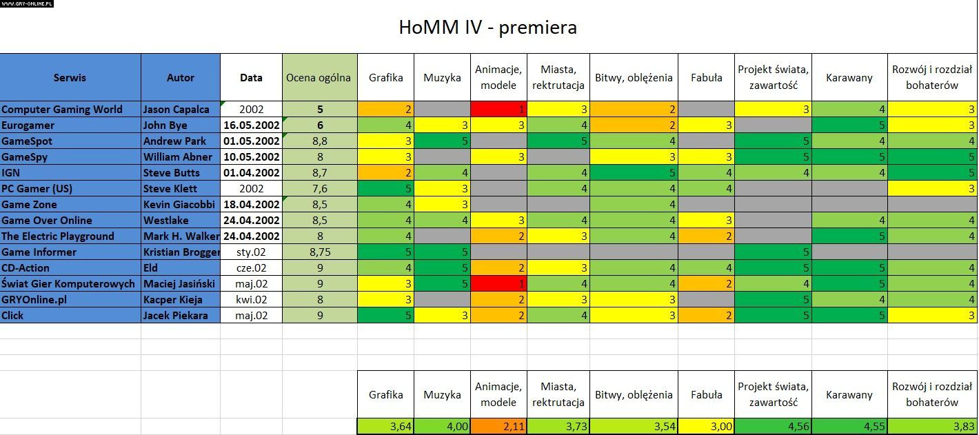 Moje pseudonaukowe badania po raz kolejny zawiodły mnie ku Excelowi i analizie recenzji portali, periodyków, serwisów internetowych, które nie później niż w tym samym roku postanowiły podzielić się z czytelnikami swoimi wrażeniami z gry. Odsiałem oczywiście teksty, będące plagą publicystyki początku XX wieku, czyli takie przypominające bardziej notkę wydawniczą niż recenzję. Bo jak wszyscy wiedzą recenzja to forma opinii, nie streszczenie mechanik, instrukcja czy opis produktu. No to do dzieła. Wspomnę tylko, że w ocenie HoMM4 znaczną rolę odegrały porównania z częścią trzecią, gdyż historycznie właśnie tak „czwórka” została zapamiętana – jako wyczekiwany następca, czasem potwarz, rozbrat tudzież bardzo odważna decyzja twórców o dokonaniu rewolucji w grze, którą pokochały miliony.