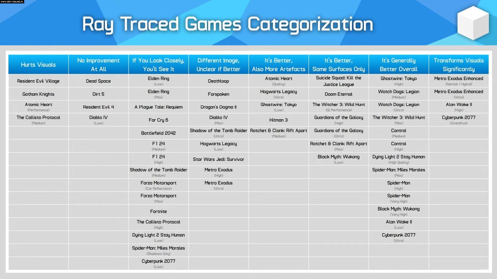 Powyższe zestawienie jest dobrym podsumowaniem testów Hardware Unboxed. Widzimy na nim gry, w którym warto uruchomić ray tracing, lub nawet zrobić upgrade komputera z myślą o tej technologii. Co jest istotne, w niektórych przypadkach efekt zależny jest od poziomu RT, ponieważ część gier pozwala wybrać jego siłę implementacji. Twórcy zastosowali taki zabieg, aby gracz mógł dopasować grę do mocy swojej karty graficznej, co także wpływa na wygląd grafiki. Przyszłość to właśnie ray tracing, lecz jak widać wiele zależy od twórców gier i naszego komputera.