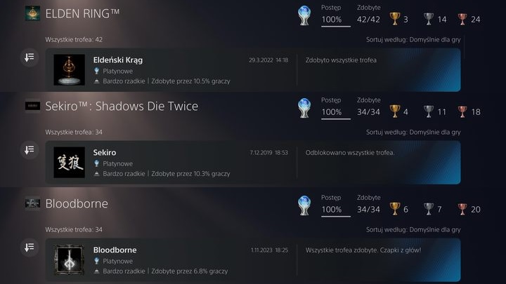 Jestem fanem gier FromSoftware – mam do tego studia wielkie zaufanie i szacunek, ponieważ potrafi tworzyć dzieła światowej klasy nie tylko pod względem rozgrywki, ale i lore’u, którego odkrycie i rozszyfrowanie wymaga zaangażowania całej społeczności. Już jakiś czas temu przeszedłem Dark Souls 2, Dark Souls 3, Demon’s Souls, Bloodborne’a, Sekiro: Shadows Die Twice oraz Elden Ringa. Nie mam za sobą jeszcze tylko Dark Souls (grałem, ale nie ukończyłem). Można więc powiedzieć, że do serii Souls podszedłem trochę na opak, chociaż w planach mam zaliczenie całej trylogii we właściwej kolejności. Bloodborne i Sekiro tak bardzo mnie zachwyciły klimatem i systemem walki, że w obu wbiłem „platynę” (załączam screeny na dowód).