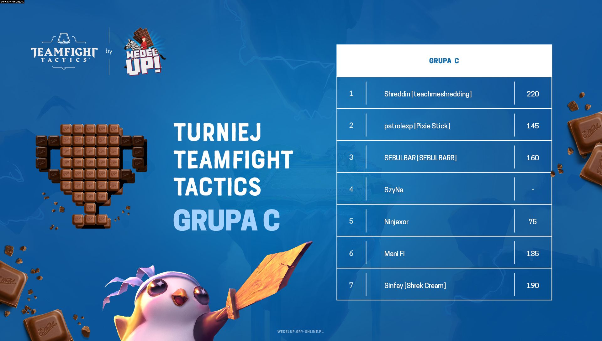 W ramach pierwszego licencjonowanego turnieju Teamfight Tactics CUP by Wedel Up!, który organizujemy dla Was wraz z marką E.Wedel oraz firmą Riot Games, zostały rozgerane mecze trzech pierwszych grup. Przed nami kolejne emocjonujące spotkania. Jeszcze dzisiaj o godzinie 19:00 zawodnicy z grupy D powalczą o awans do ćwierćfinału, nagrodę pieniężną i zestaw słodkości od marki E.Wedel. Jutro o tej samej godzinie swoje mecze rozegrają gracze z grupy E. Transmisję z rozgrywek będziecie mogli obejrzeć na naszym kanale na Twitchu.