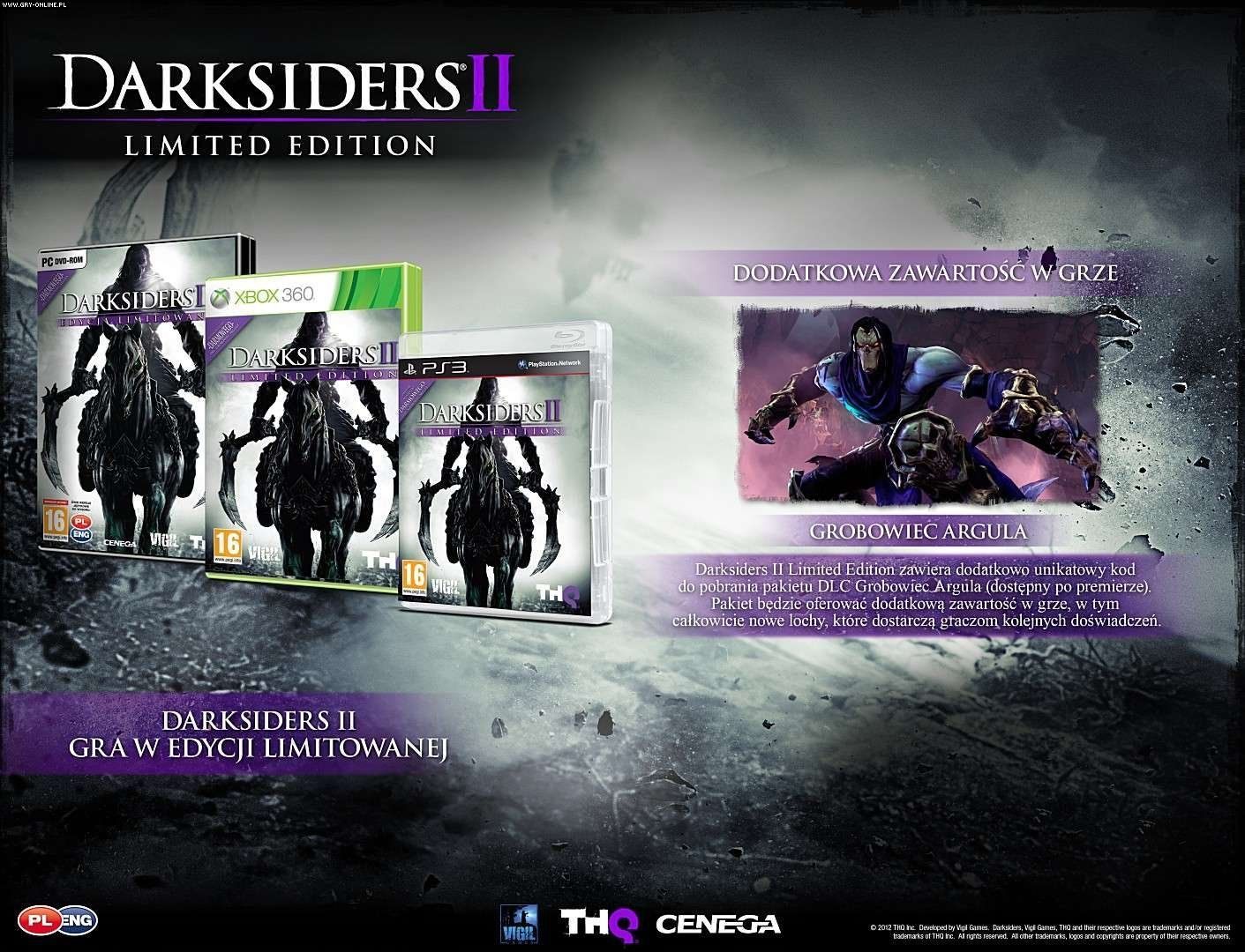 Na pecetach Darksiders II pojawi się w edycji limitowanej, wzbogaconej o DLC i kosztującej 119,99 złotych (dotyczy to całego nakładu premierowego). Posiadacze konsol PlayStation 3 i Xbox 360 otrzymają do wyboru dwie wersje: standardową (229,99 złotych) lub limitowaną (239,99 złotych). Oprócz tego, do sklepów trafi limitowana edycja kolekcjonerska za 199,99 złotych na PC i 329,99 złotych na konsolach. Poniżej prezentujemy zawartość każdego z wydań.