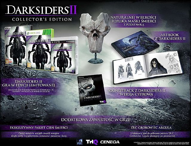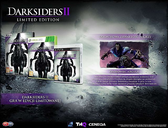 Darksiders II zostanie wydany w polskiej wersji językowej na PC, Xboksie 360 i PlayStation 3. Potwierdziła to firma Cenega Poland, która przybliżyła szczegóły wydawnicze gry. Produkcja studia Vigil pojawi się w trzech edycjach: standardowej, limitowanej oraz kolekcjonerskiej. Poznaliśmy szczegółową zawartość każdego z tych wydań. Dystrybutor przekazał przy okazji, że gra Darksiders II jest początkiem szerszej współpracy z jej wydawcą, czyli firmą THQ.