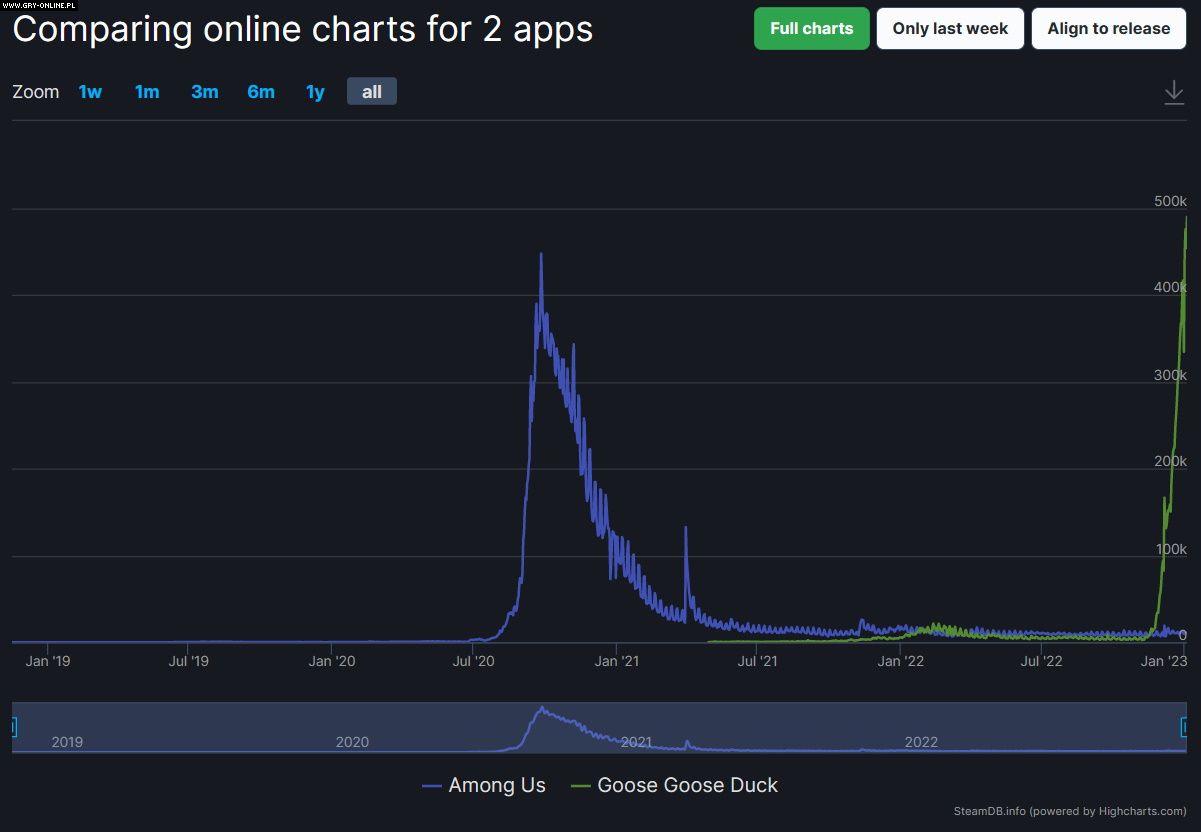 Mimo to nie można zaprzeczyć, że Goose Goose Duck stało się ostatnio niezmiernie popularne. 1 stycznia w grze na Steamie bawiło się ponad 440 tysięcy graczy naraz. Dla porównania w ten sam dzień w Among Us grało zaledwie 10 tysięcy osób, a rekordem tego tytułu jest 415 tysięcy użytkowników jednocześnie. Dzisiaj natomiast Goose Goose Duck osiągnęło wynik 560 tysięcy graczy jednocześnie. Porównanie tych dwóch gier zobaczycie poniżej.