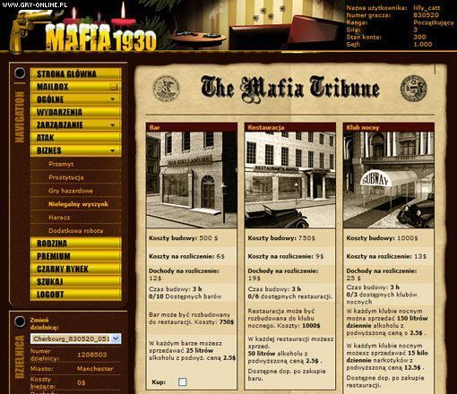 Mafia1930 to strategiczna gra, znajdująca się po przeciwnej skali w stosunku do opisywanego jakiś czas temu The Pimps, głównie dzięki eleganckiej otoczce i charakterystycznym klimacie lat trzydziestych. Tytuł ten pozwala wcielić się w początkującego mafioza, który ma na początku naszej zabawy niewielki teren pod swoją kontrolą. Poprzez sprawne zarządzanie rozrastającym się imperium, zatrudnianie pomocników i żołnierzy, czy też poszerzanie zakresu działalności (napady, druk banknotów, handel, prostytucja, alkohol) zdobywasz coraz więcej władzy i szacunku w świecie gry. Wszystko rozgrywa się w środowisku, w którym jesteś tylko jednym z tysięcy pretendentów do tronu najpotężniejszego mafioza, więc musisz wykazać się nielichym zmysłem taktycznym, ekonomicznym i, przede wszystkim, twardą ręką. Aby zagrać w Mafię1930 wejdź na tę stronę.