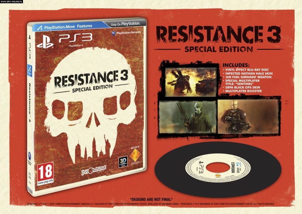 Wszystkie te bonusy wejdą też w skład Resistance 3 Special Edition – specjalnej wersji gry sprzedawanej w metalowym pudełku. Oprócz tego zestaw będzie się wyróżniał wyglądem dysku Blu-ray, przypominającym płytę winylową. Cena tej edycji nie jest znana.