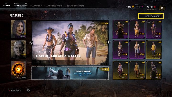 Aktywacji dokonać można w wewnętrznym sklepie Dead by Daylight. Na głównej stronie, w prawym górnym rogu znajduje się przycisk „redeem code”. Po jego wciśnięciu pojawi się panel, który pozwoli Wam wpisać powyższe kody.