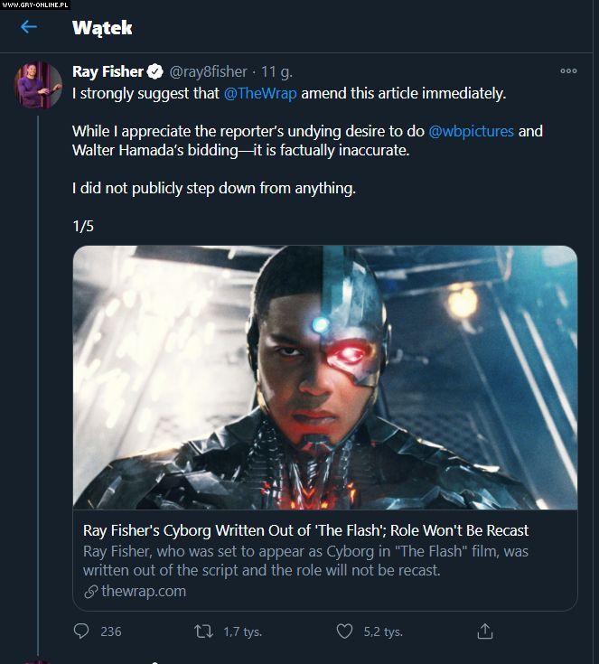 Jest jednak osoba, która dementuje doniesienia płynące z portalu The Wrap i tak – to nie kto inny, jak Ray Fisher. Aktor zażądał jak najszybszej modyfikacji treści artykułu, gdyż ma być on ponoć kłamliwy. Gwiazdor podkreśla, że nie zrezygnował publicznie z roli Cyborga i nikt z Warner Bros. nie skonsultował z nim rezygnacji z tej postaci zarówno w The Flash, jak i następnych filmach. Co więcej, Fisher uważa plotki o całkowitym usunięciu wspomnianego superbohatera za próbę uniknięcia internetowej nagonki przez WarnerMedia.