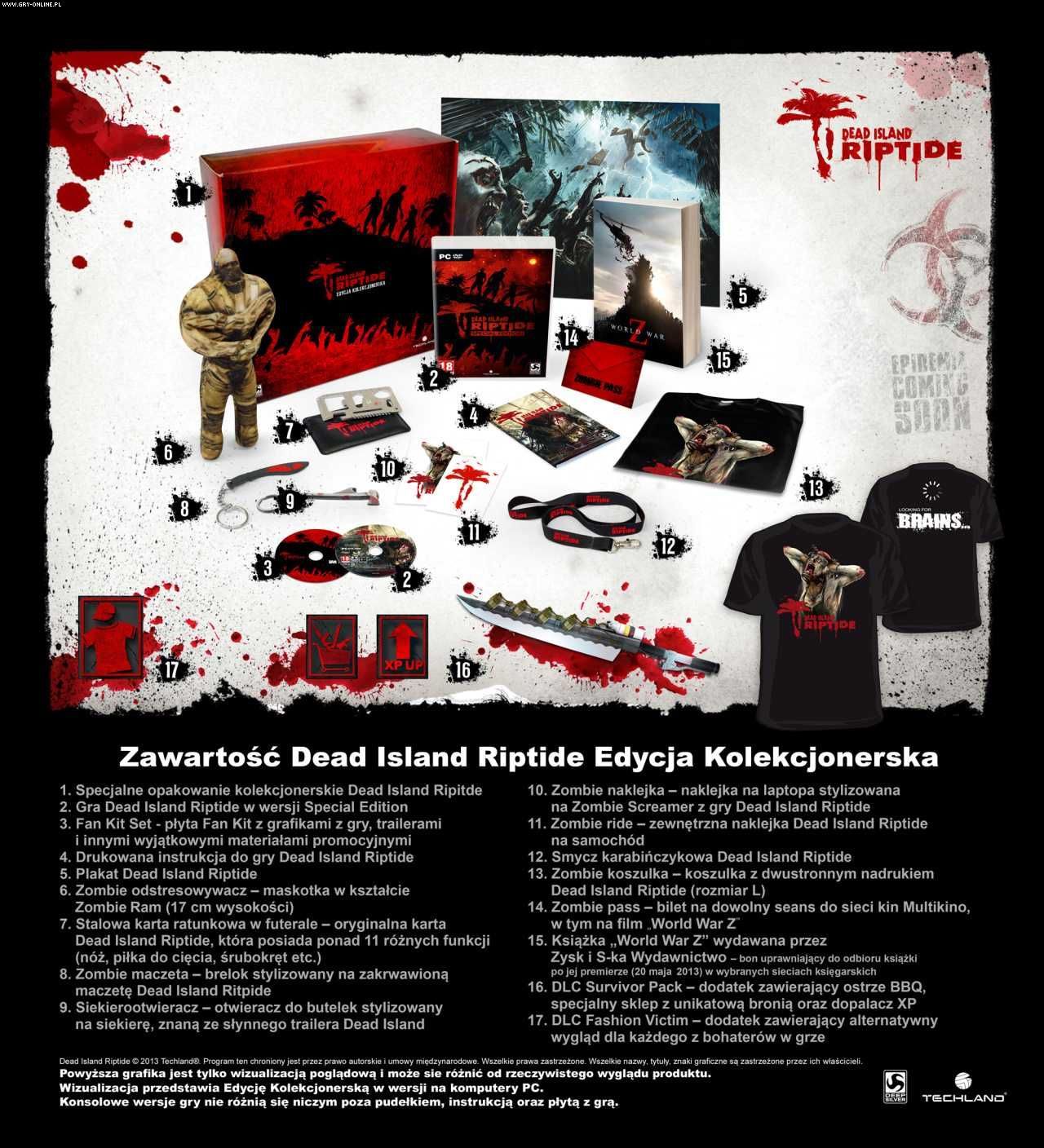 Ruszyła przedsprzedaż polskiej edycji kolekcjonerskiej Dead Island Riptide. Jej zawartość została wybrana specjalnie dla naszego kraju – nigdzie na świecie nie znajdziecie identycznego zestawu. Cena sugerowana wspomnianego wydania wynosi 199,90 złotych w wersji na PC i 299,90 złotych w edycji konsolowej (PlayStation 3 lub Xbox 360). Pre-ordery można składać m.in. w sklepie firmy Techland Wirtualny Punkt. Gra zadebiutuje 26 kwietnia tego roku.