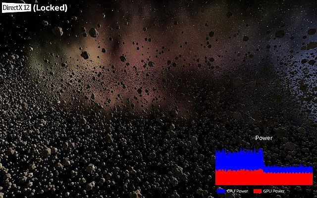 Na wykresie w rogu ekranu widzimy znaczący spadek zapotrzebowania na energię po przełączeniu się na DirectX 12
