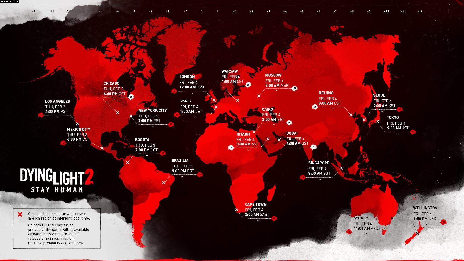 Dzięki opublikowanej przez Techland mapie poznaliśmy także dokładną godzinę premiery Dying Light 2. Na PS4, PS5, XOne i XSX|S gra będzie dostępna o północy 4 lutego, natomiast na PC – o 1:00 czasu polskiego.