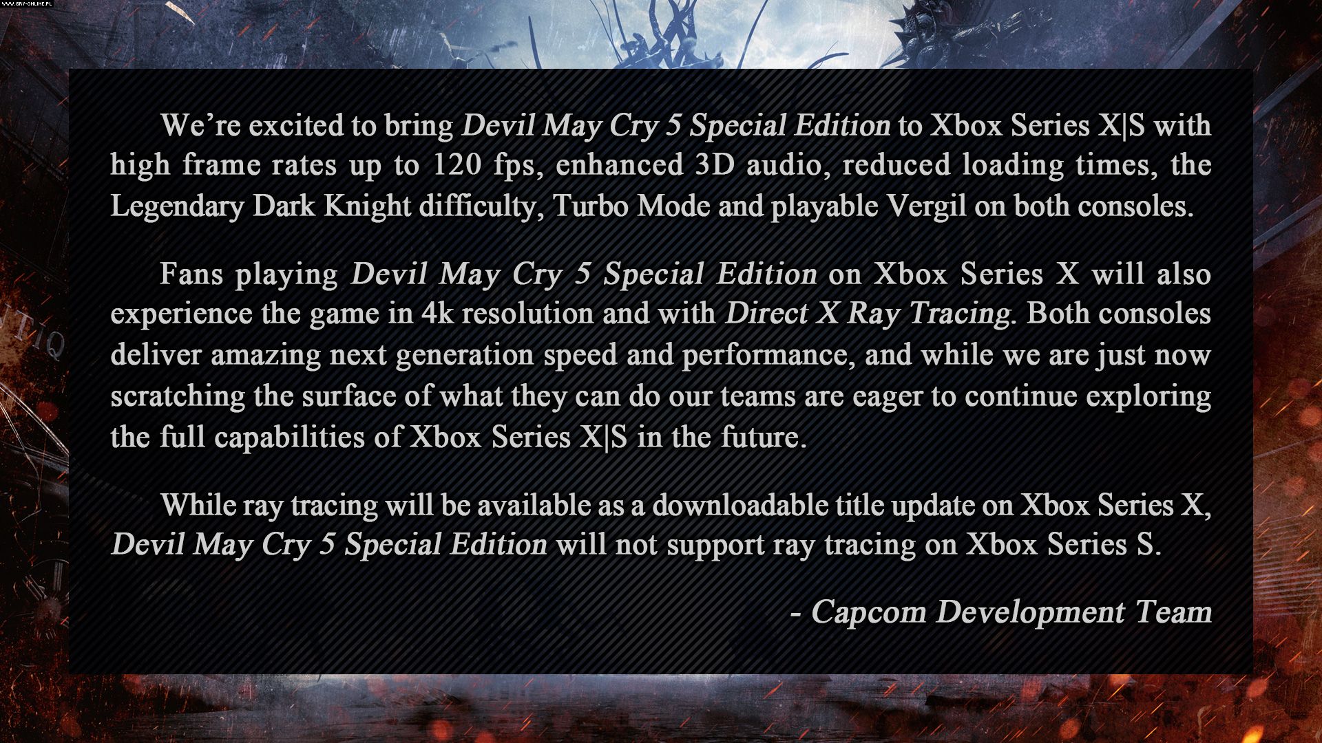 Jednym z tytułów startowych na nową generację konsol ma być ulepszona edycja gry Devil May Cry 5. Produkcja trafi na konsole Xbox Series X/S oraz PlayStation 5 już za kilka tygodni i zaoferuje na nich m.in. do 120 klatek na sekundę, a także skrócone czasy ładowania. Wersja gry na wydajniejszą konsolę Microsoftu zapewni również obsługę rozdzielczości 4K oraz technologii Direct X Ray Tracing. Dowiedzieliśmy się jednak, że użytkownicy Xboksa Series S nie uświadczą ray tracingu grając w DMC 5. Jest to oczywiście spowodowane ograniczeniami technicznymi słabszej wersji konsoli.