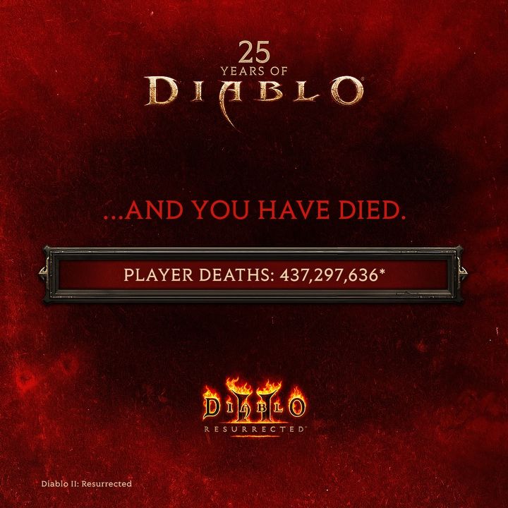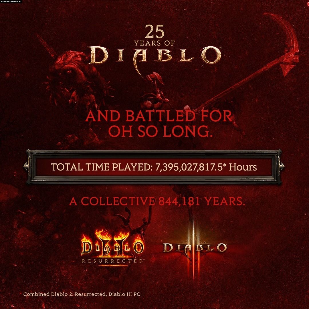 W obu ostatnich odsłonach serii fani przegrali już prawie 7,4 miliarda godzin, czyli 844 181 lat (przy czym uwzględniono tylko pecetowe wydanie Diablo 3). Natomiast w samym remasterze Diablo II gracze stworzyli więcej niż 2,1 miliarda gier, w których ubili blisko 1,5 mld bossów, aczkolwiek ich postacie przypłaciły to życiem ponad 437 milionów razy. Na szczęście zrekompensowały sobie te „kontuzje” skarbami, bo od premiery Diablo II: Resurrected bohaterowie zdobyli łącznie 43,5 biliona sztuk złota.