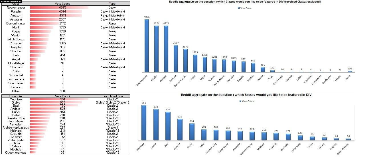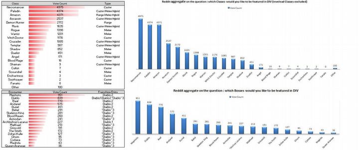 Użytkownik forum Reddit o ksywie pisulanu zebrał dane z kilku wątków oraz ankiet Strawpol. Jego celem było wyłonienie klas oraz starć z bossami z serii Diablo, które gracze najchętniej zobaczyliby znów w kolejnej odsłonie. Nie uwzględniono przy tym postaci już zapowiedzianych, takich jak Czarodziejka czy Barbarzyńca.