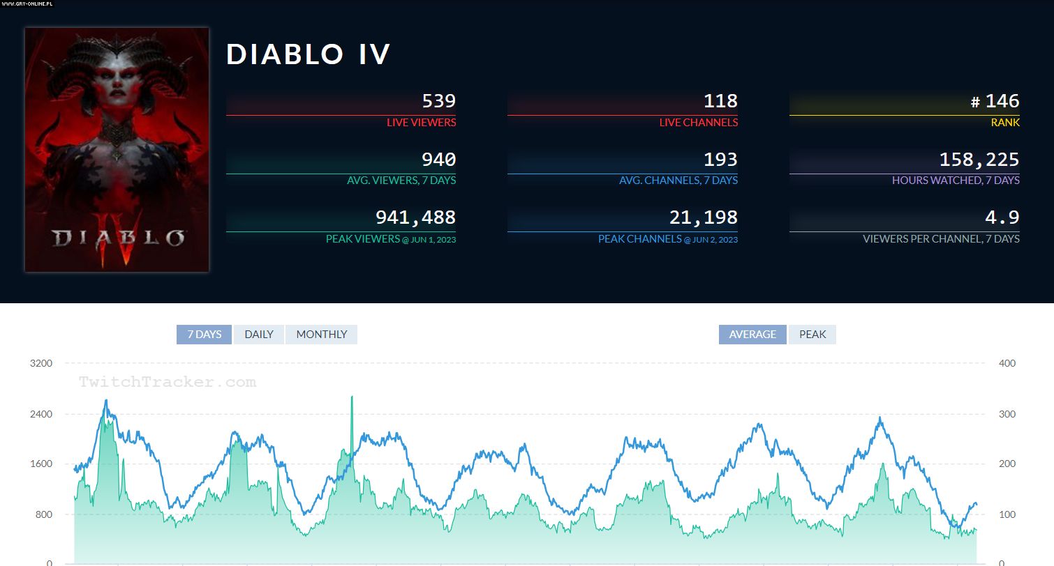 Co prawda Diablo II (616. miejsce) jest daleko w tyle za częścią zarówno trzecią, jak i czwartą, ale według danych Twitch Trackera „dwójka” w ostatnim miesiącu również odnotowała niewielki wzrost liczby widzów, a Diablo II: Resurrected (360. miejsce) utrzymuje się na niskim, lecz stałym poziomie; jeśli Diablo 4 nie odwróci tendencji spadkowej, to być może niedługo zostanie z mniejszą liczbą widzów niż wszyscy poprzednicy.
