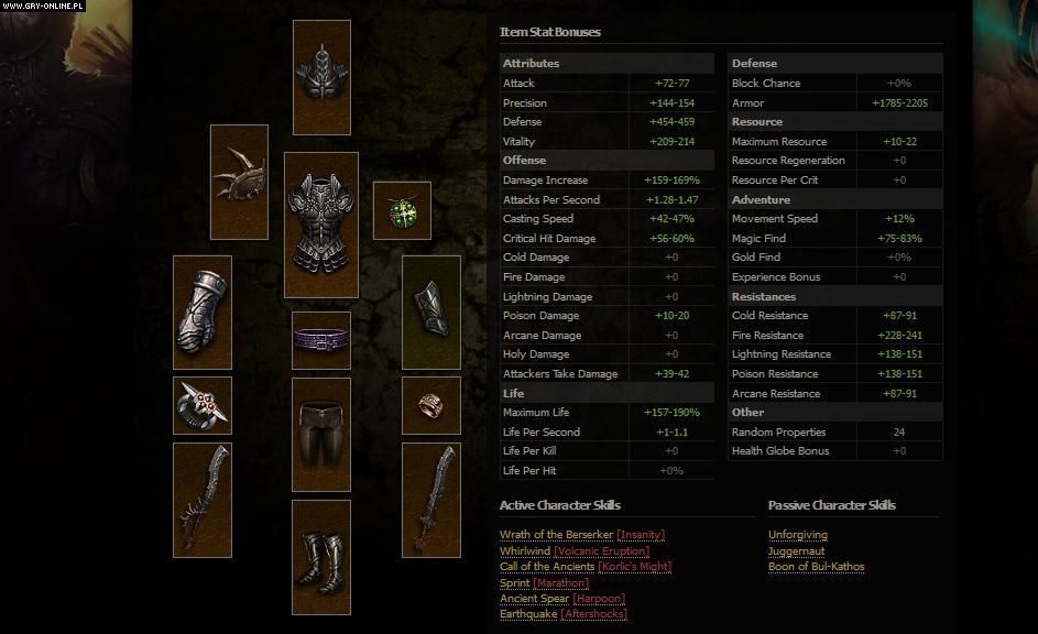Po prawej stronie na bieżąco aktualizowane są bardzo dokładne statystyki odzwierciedlające wpływ uzbrojenia na cechy postaci. Uwzględniają one wszelkie modyfikatory: od rodzaju zadawanych obrażeń, przez dodatkowe punkty życia za każde zabójstwo, po bonusowe złoto wypadające z pokonanych wrogów. Łącznie możemy przeanalizować 35 parametrów.