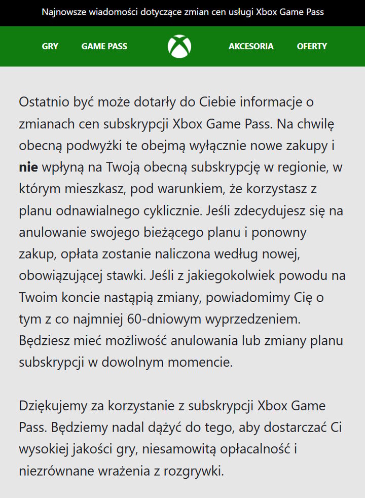 Ostatnio być może dotarły do Ciebie informacje o zmianach cen subskrypcji Xbox Game Pass. Na chwilę obecną podwyżki te obejmą wyłącznie nowe zakupy i nie wpłyną na Twoją obecną subskrypcję w regionie, w którym mieszkasz, pod warunkiem, że korzystasz z planu odnawialnego cyklicznie. Jeśli zdecydujesz się na anulowanie swojego bieżącego planu i ponowny zakup, opłata zostanie naliczona według nowej, obowiązującej stawki. Jeśli z jakiegokolwiek powodu na Twoim koncie nastąpią zmiany, powiadomimy Cię o tym z co najmniej 60-dniowym wyprzedzeniem. Będziesz mieć możliwość anulowania lub zmiany planu subskrypcji w dowolnym momencie.