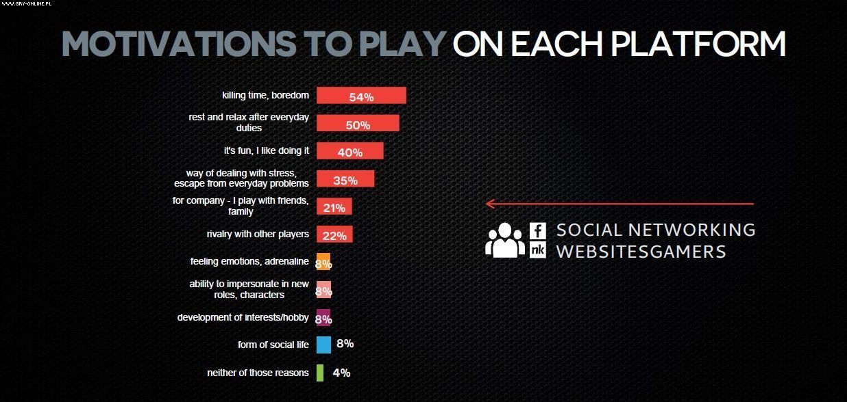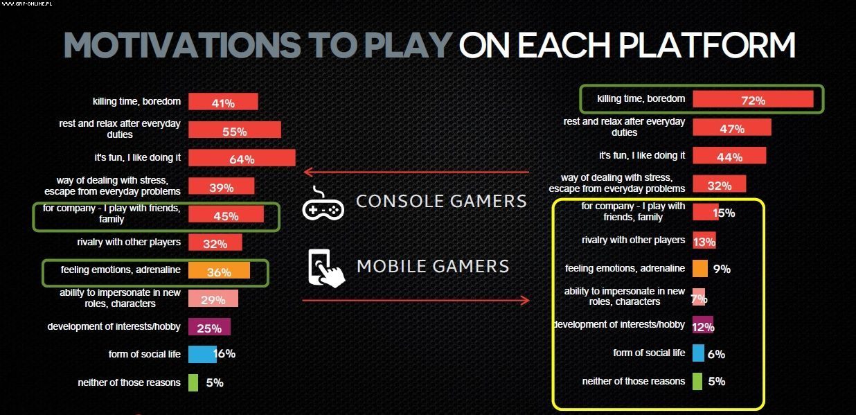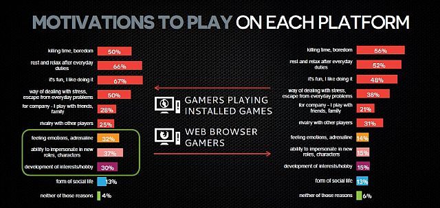 Powodów jest wiele, a każdy z nas z pewnością wymieniłby kilka. Tak też zrobili respondenci, przy czym odpowiedzi w znacznym stopniu różniły się w zależności od platformy sprzętowej. W przypadku pecetów i konsol, czyli środowiska różnej maści dużych tytułów AAA, najczęściej wymienianymi motywacjami były odpowiednio: zamiłowanie do tego typu rozrywki oraz potrzeba relaksu. Konsolowcy okazali się być najbardziej społeczną grupą – prawie połowa (45%) gra dla towarzystwa, bawiąc się wspólnie ze znajomymi lub rodziną.