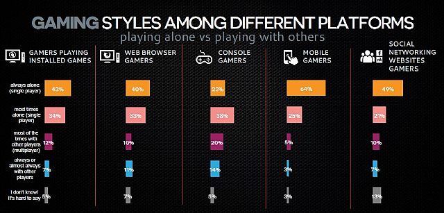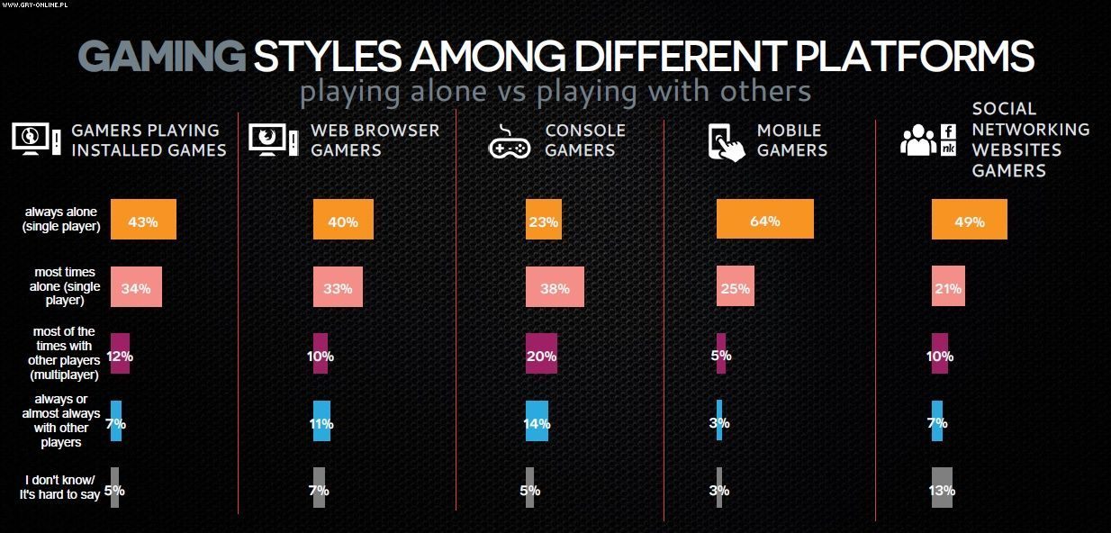 Rosnąca popularność trybów wieloosobowych na świecie najwyraźniej nie ma odzwierciedlenia w Polsce. Rozgrywkę przeznaczoną dla jednego gracza preferuje w sumie 74% graczy, przy czym aż 47% w ogóle nie sięga po multiplayer. Największymi samotnikami są użytkownicy urządzeń mobilnych. Z kolei największy odsetek osób lubiących grać z innymi występuje wśród konsolowców.