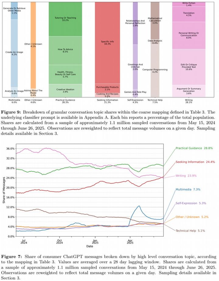 Podstawą dla opublikowanych statystyk było około 1,1 miliona konwersacji ze sztuczną inteligencją, odbytych od maja 2024 do czerwca 2025. Wynika z nich, że aż 28,1% rozmów dotyczyło pisania, co czyni tę kategorię drugą najpopularniejszą, zaraz po wskazówkach dotyczących życia codziennego (28,3%). W przypadku pisania, kategorię podzielono na pięć sekcji: