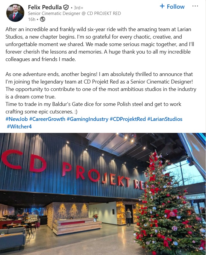 Po zrekrutowaniu Karela Kolmanna z Warhorse Studios (Kingdom Come: Deliverance) studio CD Projekt Red przygarnęło kolejnego twórcę doświadczonego w grach RPG. Tym razem padło na Felixa Pedullę, który w zespole odpowiedzialnym za Baldur’s Gate 3 pełnił rolę starszego projektanta przerywników filmowych i taką samą rolę objął w ekipie pracującej nad nowym Wiedźminem.