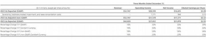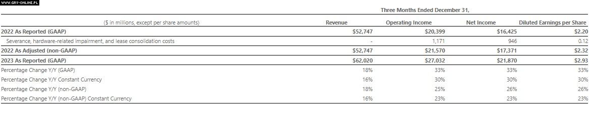 Microsoft dostarczył tabelę, porównującą wyniki finansowe, zgodnie z ogólnie przyjętymi zasadami rachunkowości i wyniki finansowe nieoparte na GAAP. Wszelkie porównania wzrostu odniesiono do analogicznego okresu w ubiegłym roku fiskalnym.