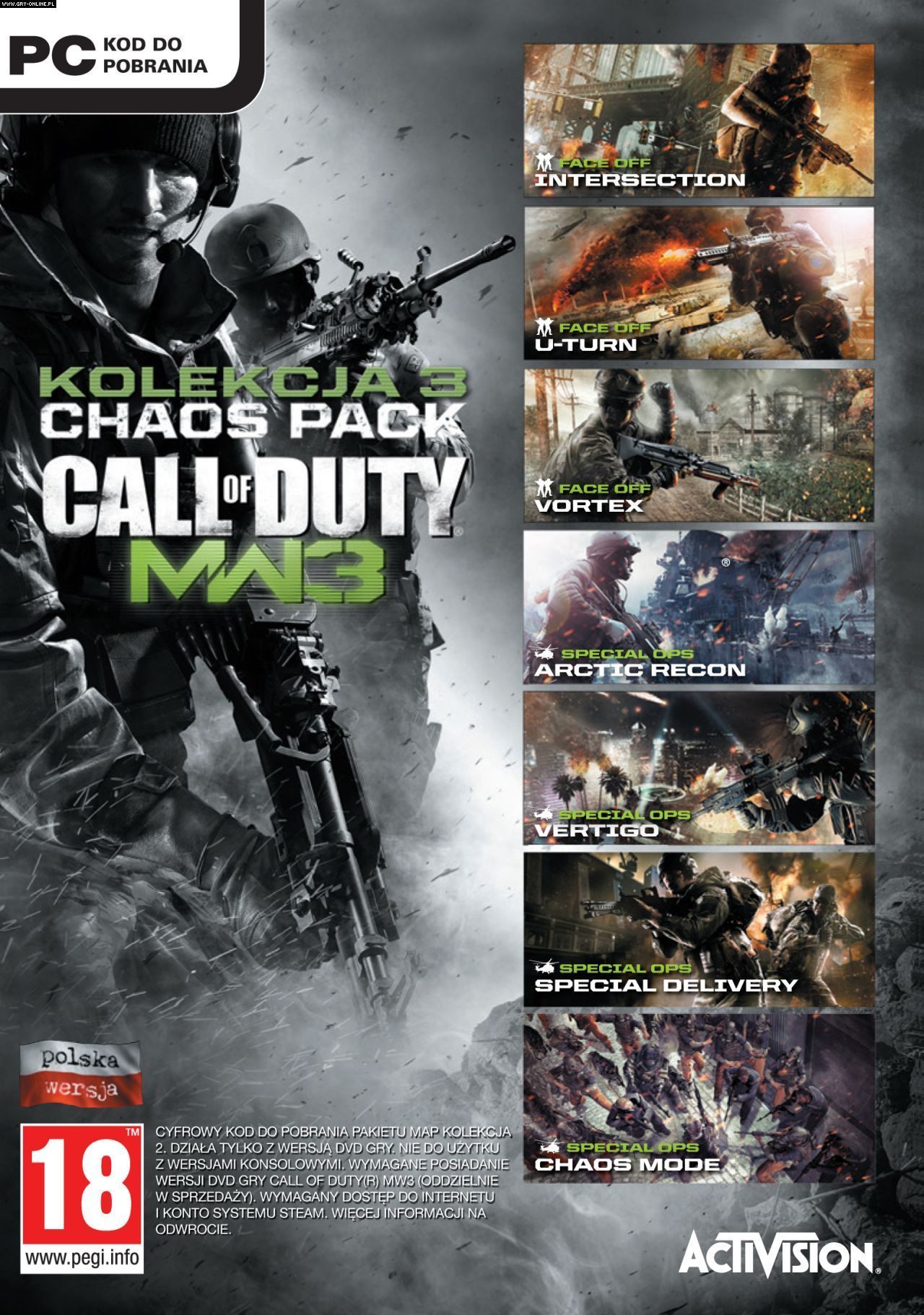 Jest nam niezmiernie miło zakomunikować, iż dodatek KOLEKCJA 3: CHAOS PACK do gry Call of Duty Modern Warfare 3 na komputery osobiste jest już dostępny w Polskich sklepach. Dodatek ten został wydany w polskiej wersji językowej, w pudełku, a jego sugerowana cena detaliczna to 59,99 zł.