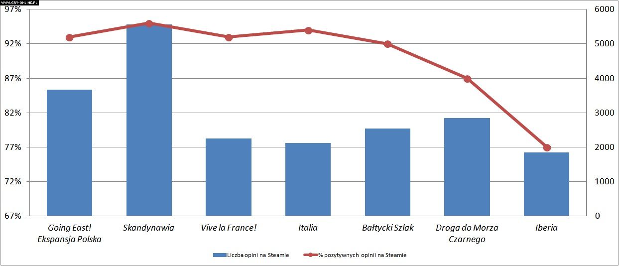 Jak dotąd żadne z rozszerzeń nie dorównało podstawce nie tylko pod względem popularności (co jest oczywiste), ale też ocen użytkowników Steama. Najlepiej wypada Skandynawia, która ma najwięcej opinii – tak ogólnie (5655), jak i tylko tych pozytywnych (95%).