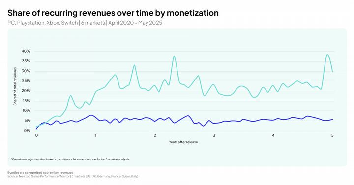 Między 12. a 60. miesiącem od premiery rozbieżności między gatunkami są ogromne. RPG-i nadal świetnie radzą sobie z narracyjnymi rozszerzeniami, ale w innych gatunkach rządzą: