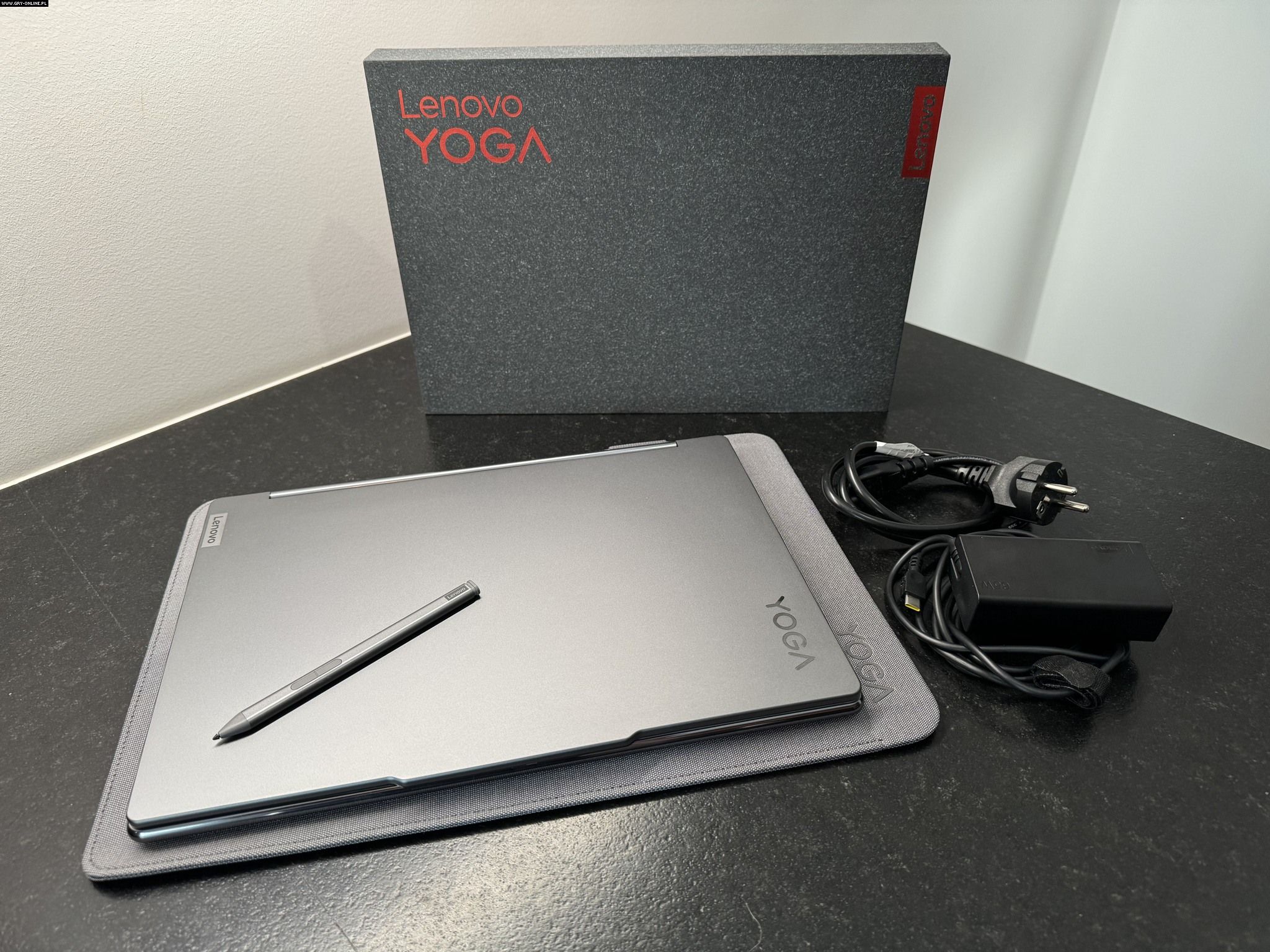 Yoga trafiła do mnie do testów z całym zestawem akcesoriów – widać, że producent pozycjonuje ten model nieco wyżej. W końcu klasyczne laptopy najczęściej w kartonie mają dołączony jedynie zasilacz. Tutaj dostajemy z kolei także rysik (choć jeśli kupimy laptopa o tym nie wiedząc, możemy go przegapić, schowanego głęboko w kartonie!) oraz etui na laptopa ze specjalnym uchwytem na rysik z boku.