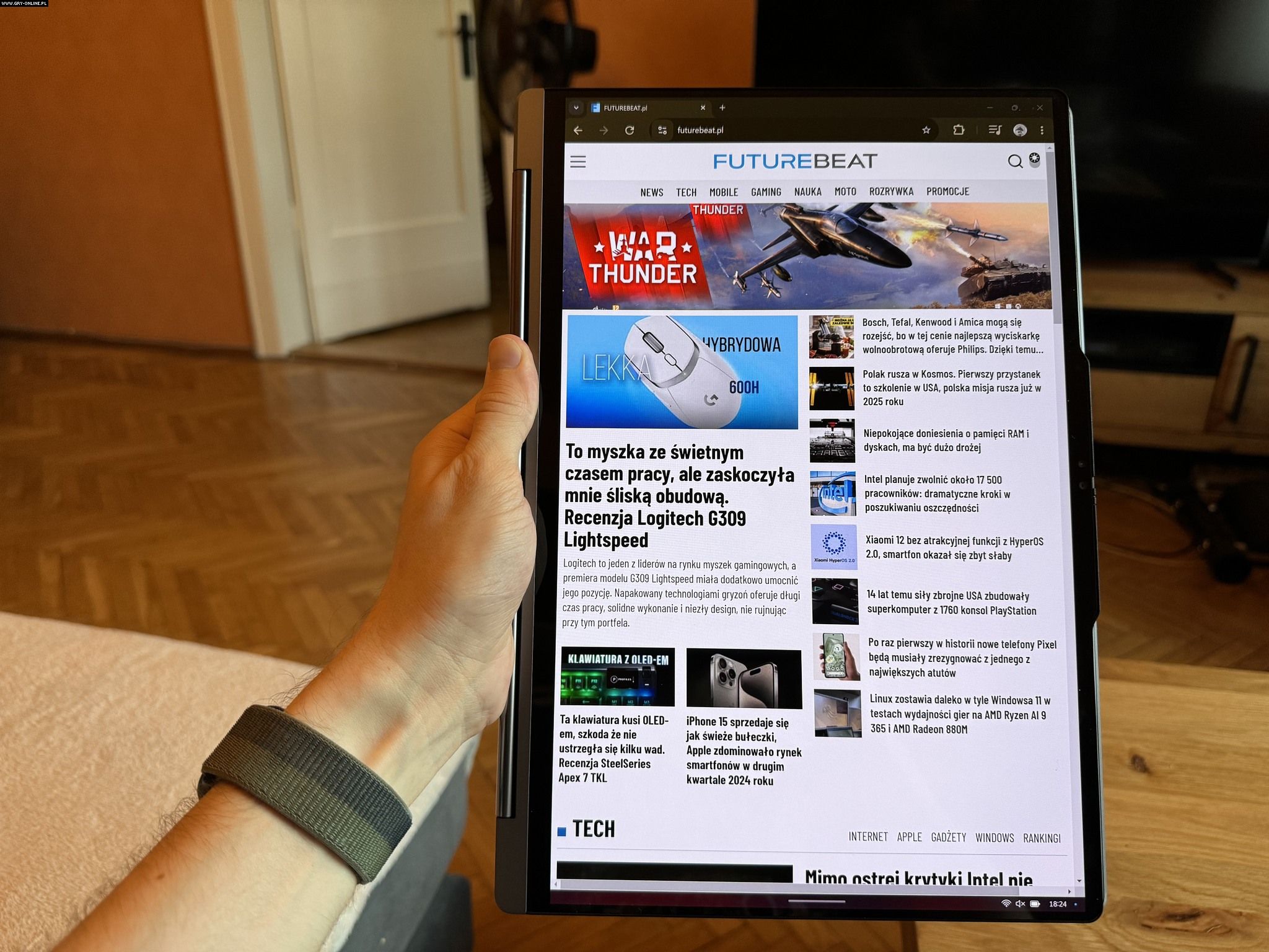 Czytanie newsów w ten sposób jest przyjemne, choć samo urządzenie jest ciut za duże i za grube, by robić to przez dłuższy czas.Źródło: fotografia własna.