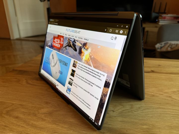 Jeśli nie mieliśmy nigdy wcześniej urządzenia z ekranem obracanym o 360 stopni, kilka pierwszych dni spędzimy na odkrywaniu różnych układów i scenariuszy użytkowania. klapa ma spory opór, przez co praktycznie każde ułożenie jest stabilne. Ma to jednak też słabą stronę – najczęściej wymaga użycia dwóch rąk, a pełne odwrócenie ekranu wymaga pewnej wprawy i nie przebiega płynnie. Albo przynajmniej mnie nie udało się tego robić bez odrobiny wysiłku.