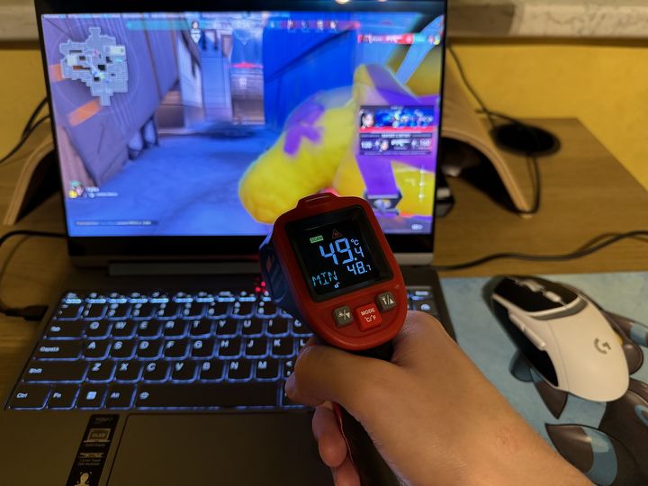 Przy dłuższym obciążeniu temperatura obudowy w najgorętszym miejscu wyniosła 49,4 stopnia, tuż nad przyciskami funkcyjnymi klawiatury. Sprzęt generalnie był dość ciepły (powyżej 42 stopni), jednak najwyższa temperatura była w górnej części, nad klawiaturą, zatem w miejscu raczej rzadko dotykanym w czasie klasycznego użytkowania.