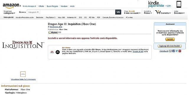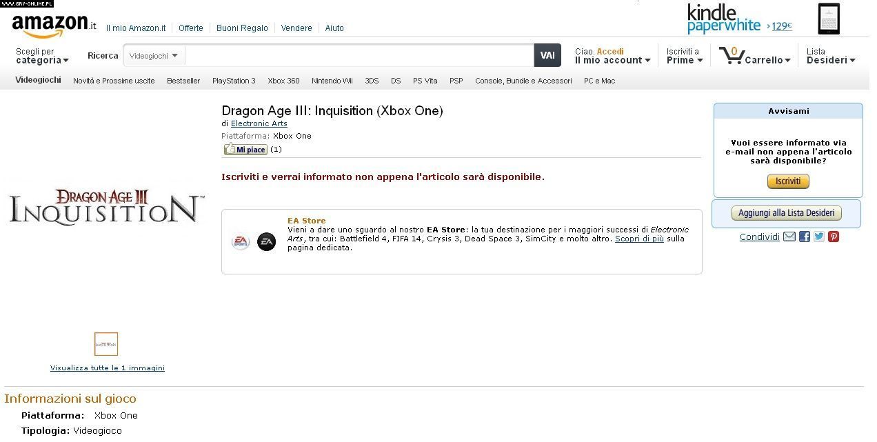 We włoskim oddziale sklepu Amazon pojawiła się gra Dragon Age III: Inquisition w wersji na konsolę Xbox One. Obecnie ciężko już się jej doszukać, na szczęście w Internecie nic nie ginie i zachowało się potwierdzenie oferty.
