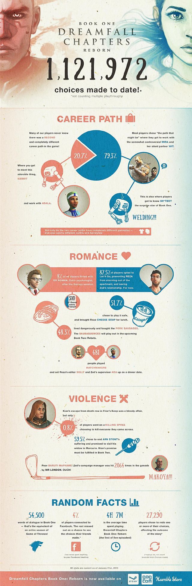 Aby umilić im oczekiwania na kolejny odcinek, Red Thread Games - studio odpowiedzialne za Dreamfall: Chapters, właśnie ujawniło specjalną infografikę, podsumowującą ich dokonania w pierwszym epizodzie. Pośród najistotniejszych wypada wymienić przede wszystkim fakt, iż jedynie 20,7% graczy wybrało alternatywną ścieżkę kariery oraz to, że tylko 0,8% zdecydowało się kroczyć ścieżką przemocy od początku do końca, zabijając wszystko co możliwe. Podczas pierwszego przejścia wstępnego odcinka, podjęto łącznie ponad milion decyzji, zaś przeciętny czas rozgrywki wyniósł cztery godziny i siedem minut. Co ciekawe, całkiem niedawno długość przygody skomentował jeden z twórców gry. Na Twitterze umieścił wpis, w którym wytknął innym produkcjom to, że ich kampanie potrafią trwać krócej niż ta zaprezentowana w pojedynczym epizodzie Dreamfall: Chapters.