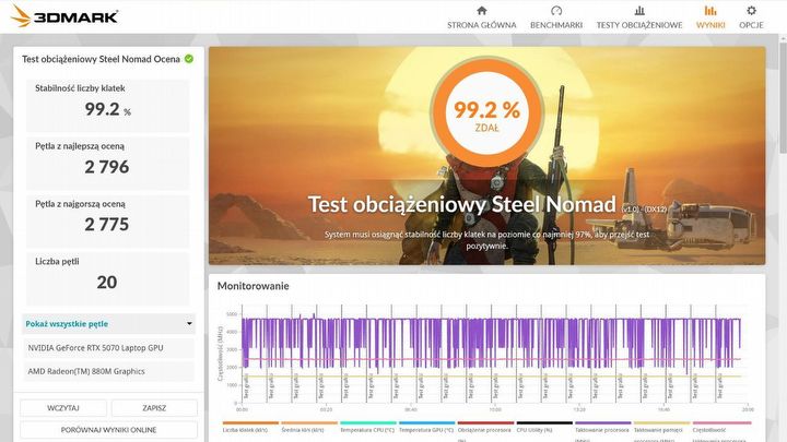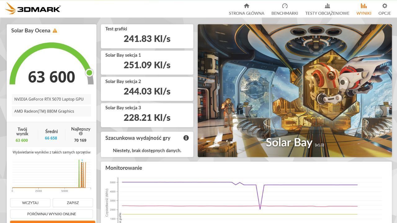 Niestety, jak w przypadku każdego laptopa gamingowego, sprzęt ten lubi się grzać. Jest także dosyć głośny, ponieważ gdy wentylatory rozkręcą się na pełną moc, można pomyśleć, że ktoś w pobliżu odkurza. Temperatura procesora spokojnie dochodziła do 75 stopni, a nawet przekraczała 80 stopni Celsjusza. Poniżej prezentuję wyniki benchmarków: