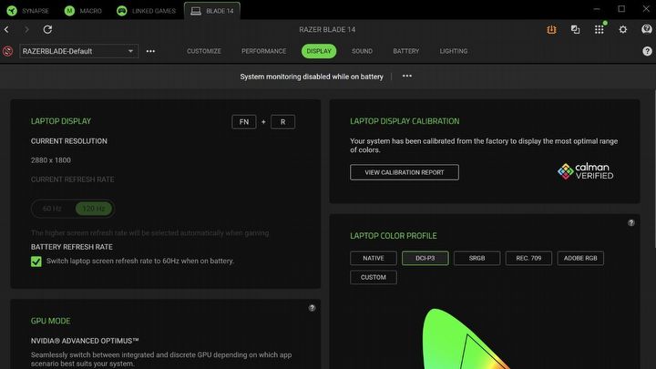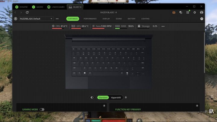 W trakcie korzystania z oprogramowania Synapse nie zauważyłem większych problemów. Wciąż nie pałam miłością do tego softu, ale w przypadku laptopa Razer Blade jest on dosyć prosty i intuicyjny. Za jego pomocą możemy regulować pracę wentylatorów oraz kwestie związane z wydajnością. Mamy także dostęp do monitora podzespołów i muszę tutaj przyznać, że laptop potrafi się solidnie rozgrzać, zwłaszcza gdy uruchomimy grę z otwartym światem, taką jak KCD 2.