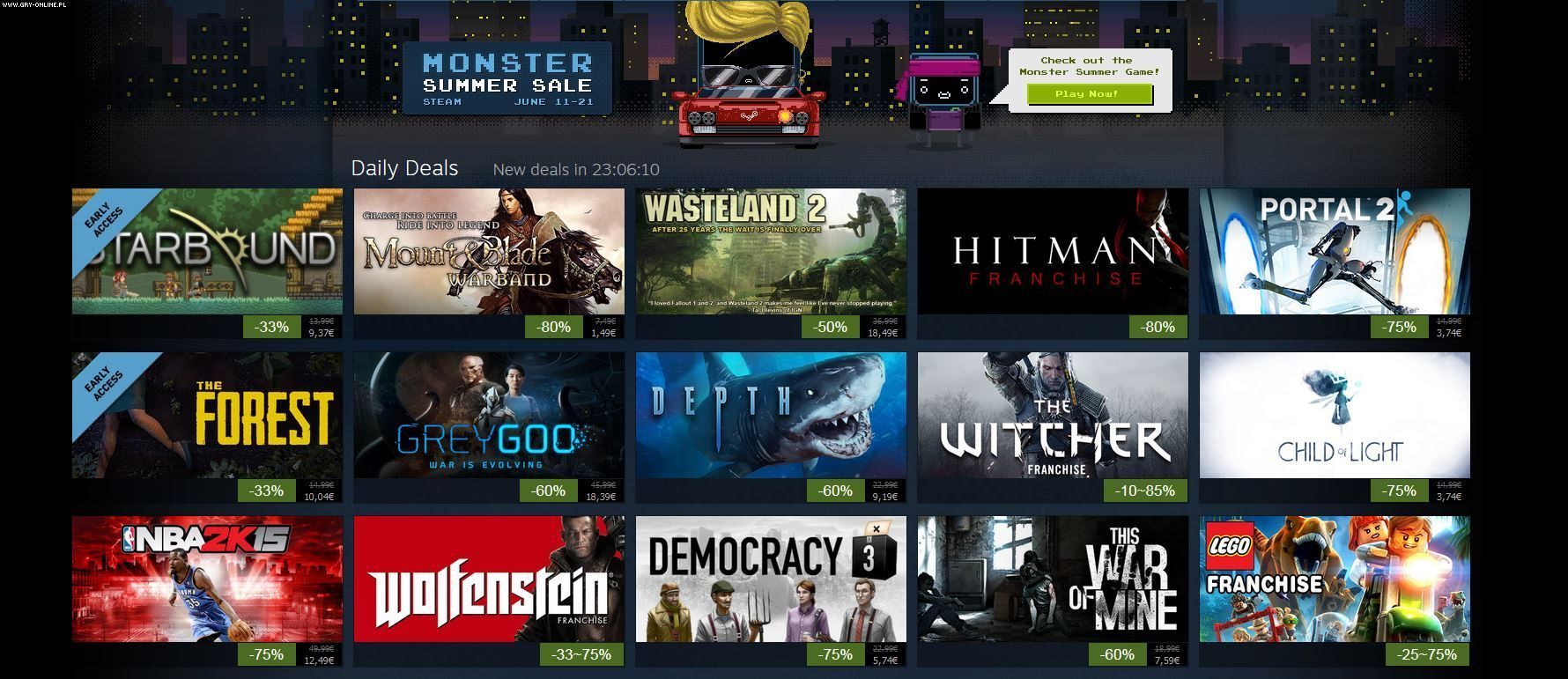 Wystartował drugi dzień letniej wyprzedaży w serwisie Steam. Gracze mogą liczyć na całą gamę różnych promocji i przecen. Oferowane zniżki wahają się zazwyczaj w granicach 50-75%. Większe i mniejsze upusty dotknęły znaczną część steamowego katalogu. Promocje przygotowane przez Valve dzielą się tym razem na trzy podstawowe rodzaje: oferty dnia (zmieniające się co dobę o godzinie 19:00), błyskawiczne oferty (aktualizowane co 12 godzin – codziennie o 7:00 i 19:00 czasu polskiego), a także specjalne zniżki, które zależą od postępów użytkowników serwisu w okolicznościowej grze przeglądarkowej Monster Summer Game. Tradycyjnie, oferty z ubiegłego dnia będą dostępne jeszcze przez najbliższe 24 godziny.