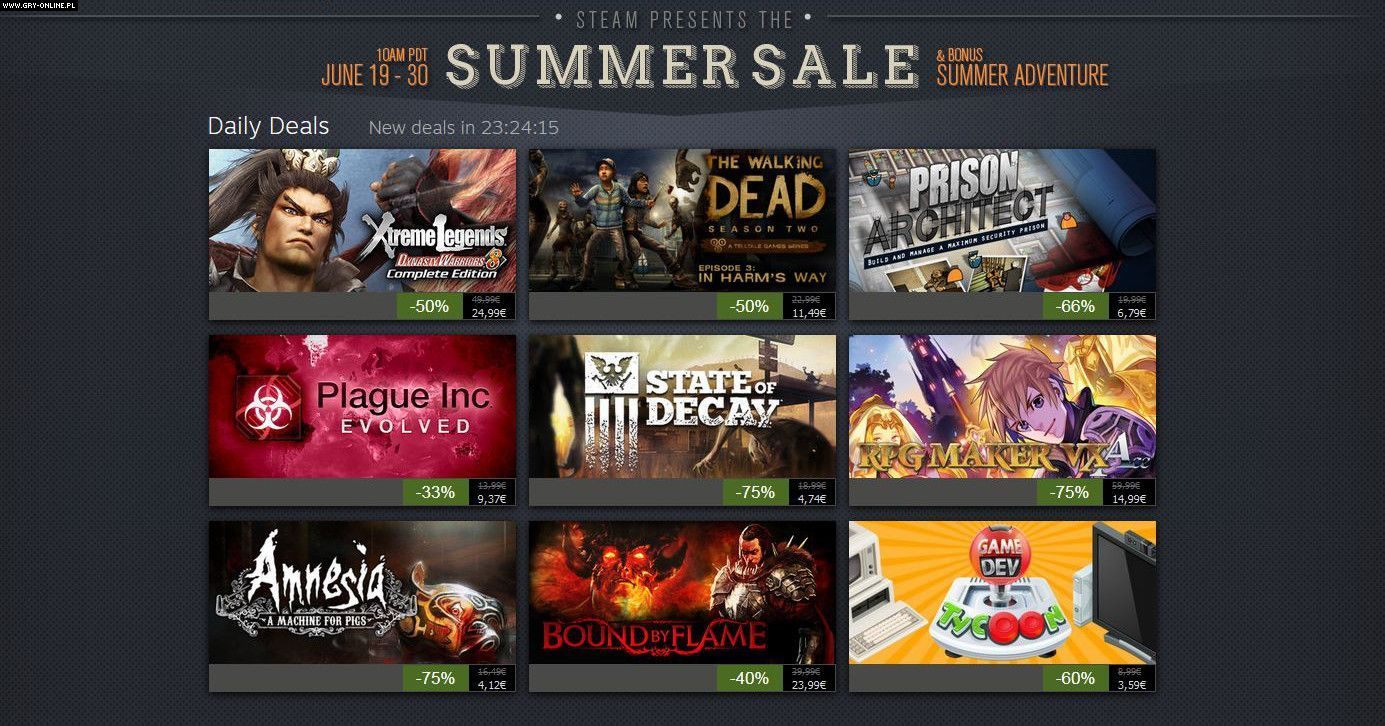 Zaczął się drugi dzień wyprzedaży na Steamie, która zakończy się 30 czerwca. Wśród gier przecenionych w ofercie dnia znalazły się przede wszystkim tytuły niezależnych deweloperów. Gracze mogą zakupić produkcje, takie jak Prison Architect, Bound by Flame, The Walking Dead: Season Two czy Amnesia: A Machine for Pigs.