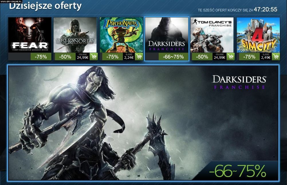 W drugim dniu zimowej wyprzedaży w serwisie Steam gracze otrzymują kolejną paczkę specjalnych ofert i przecen. Możemy wybierać spośród, między innymi, Dishonored, Sim City 4, Darksiders II lub gier z serii F.E.A.R. i Tom Clancy's.