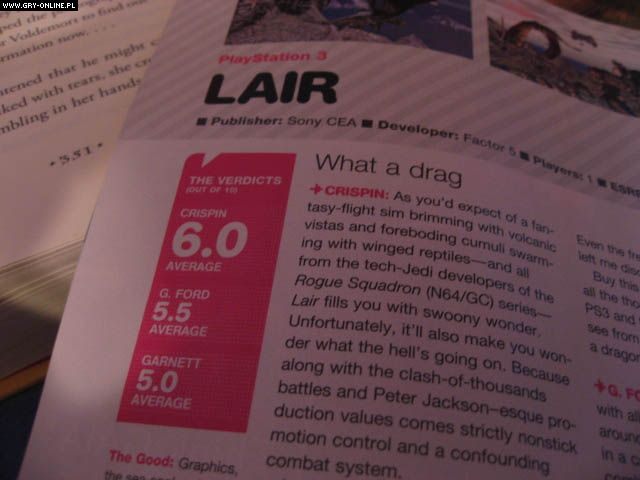 Zagraniczne media najwyraźniej nie są zgodne w ocenie nadchodzącej wielkimi krokami gry Lair, tworzonej przez studio Factor 5. Podczas gdy EDGE Magazine i serwis Gamezone oceniają produkcję na 9/10, Electronic Gaming Monthly i GamePro stawiają ją trochę powyżej połów swoich skal punktowych.