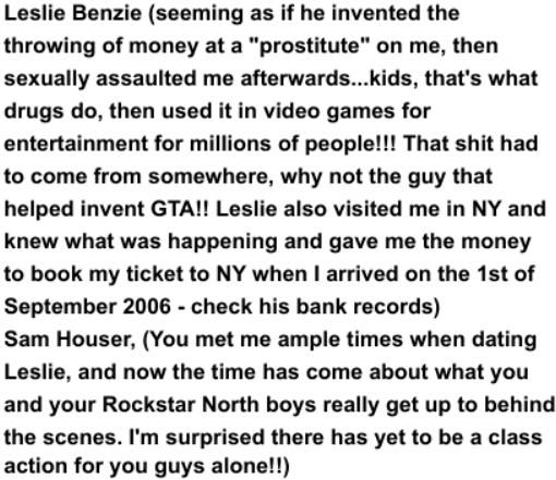 Leslie Benzies (wygląda na to, że wymyślił rzucanie pieniędzmi w „prostytutkę” na moim przykładzie, a potem wykorzystał mnie seksualnie… dzieciaki, oto co robią narkotyki… a potem użył tego w grach wideo dla rozrywki milionów ludzi!!! To gówno musiało się skądś wziąć, więc dlaczego nie od faceta, który pomagał stworzyć GTA!! Leslie odwiedził mnie też w Nowym Jorku, wiedział, co się działo i dał mi pieniądze na bilet do NY, kiedy przyjechałam 1 września 2006 roku – sprawdźcie jego wyciągi bankowe).