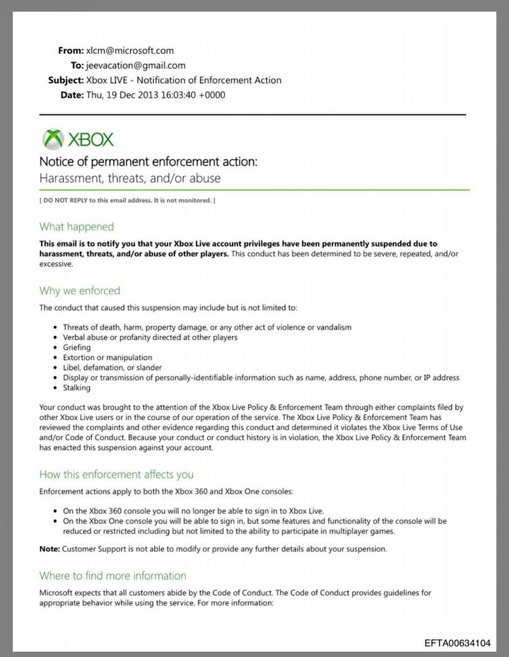 Epstein był już jednak wówczas zarejestrowany jako przestępca seksualny i zdaje się, że to było prawdziwym powodem. W 2012 roku Xbox wraz z innymi firmami (m.in. Sony, EA czy Blizzardem) rozpoczął bowiem współpracę ze stanem Nowy Jork w celu zakazania przestępcom seksualnym korzystania z ich platform.