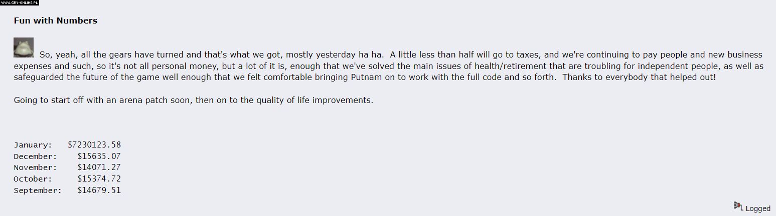 […] Trochę mniej niż połowa pójdzie na podatki, nadal będziemy płacić ludziom, mamy nowe wydatki biznesowe i takie tam, więc nie są to pieniądze tylko prywatne, ale wiele z nich jest, wystarczająco, żeby rozwiązać główne problemy związane z ubezpieczeniem/emeryturą, które są kłopotliwe dla niezależnych twórców. Zabezpieczyliśmy również przyszłość gry na tyle dobrze, że poczuliśmy się komfortowo, sprowadzając Putnama do pracy z pełnym kodem i tak dalej. Dziękujemy wszystkim, którzy nam pomogli!