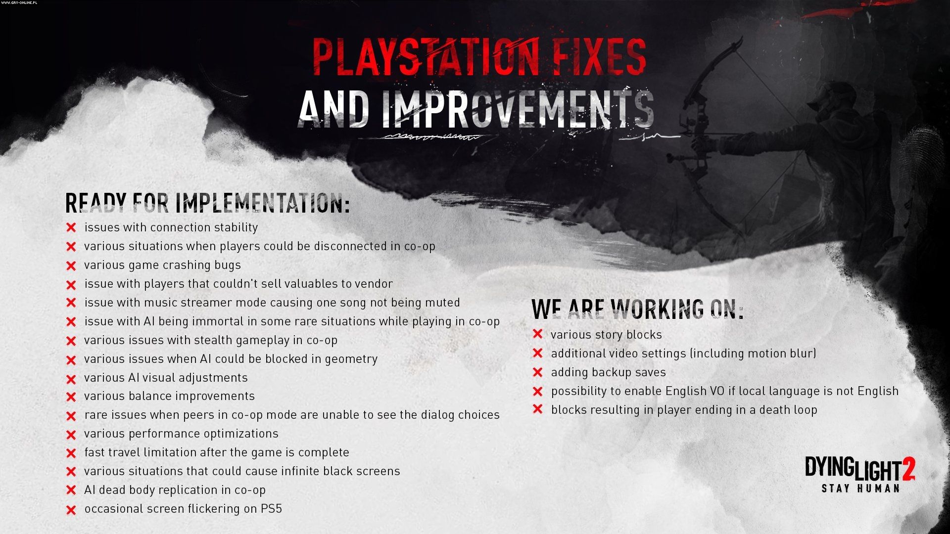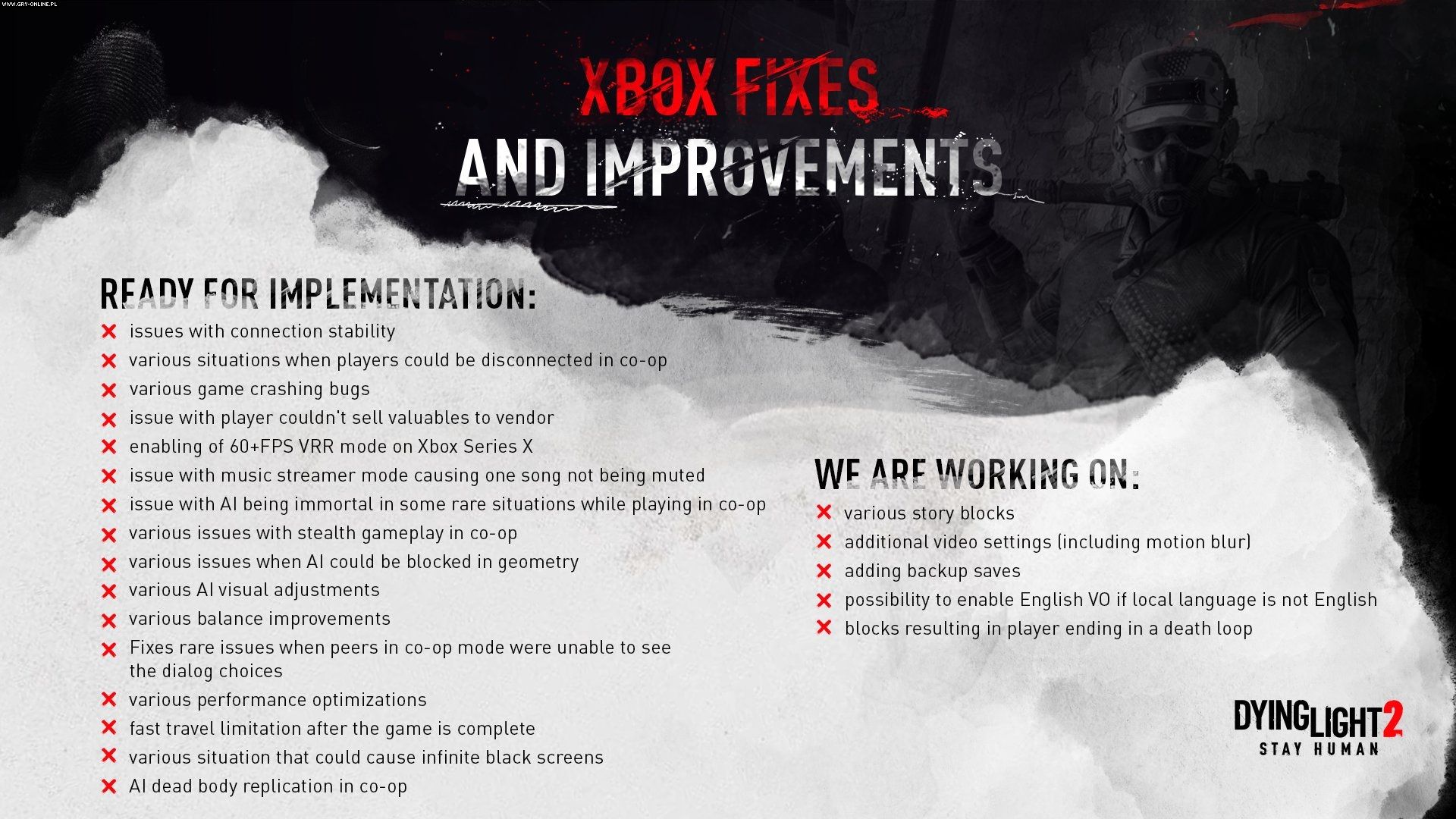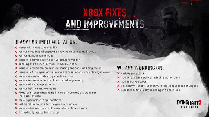 Jeśli uważnie się im przyjrzycie, zauważycie, że w kolejnych tygodniach Techland zamierza wprowadzić m.in. możliwość ustawienia angielskiego dubbingu i napisów w dowolnym innym języku (obecnie problem ten da się rozwiązać wyłącznie na PC, ingerując w pliki gry) oraz posiadania kilku stanów zapisu (obecnie dostępny jest tylko jeden). Można więc stwierdzić, że deweloper z uwagą słucha opinii społeczności.