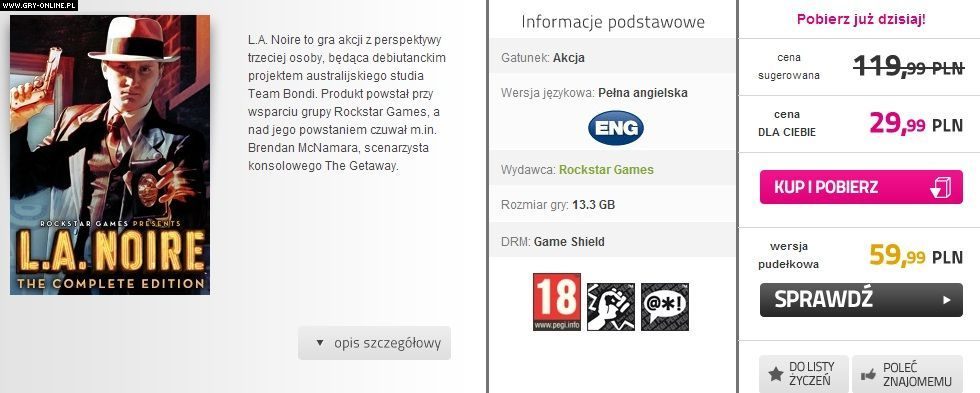 Wczoraj wystartowała promocja sklepu Muve.pl na gry firm 2K i Rockstar. W poniedziałek mogliście kupić Spec Ops: The Line na PC w cenie 14,99 zł, natomiast dzisiaj do zgarnięcia jest cyfrowa wersja L.A. Noire za 29,99 zł. Pudełkowy egzemplarz to wydatek rzędu 59,99 zł.
