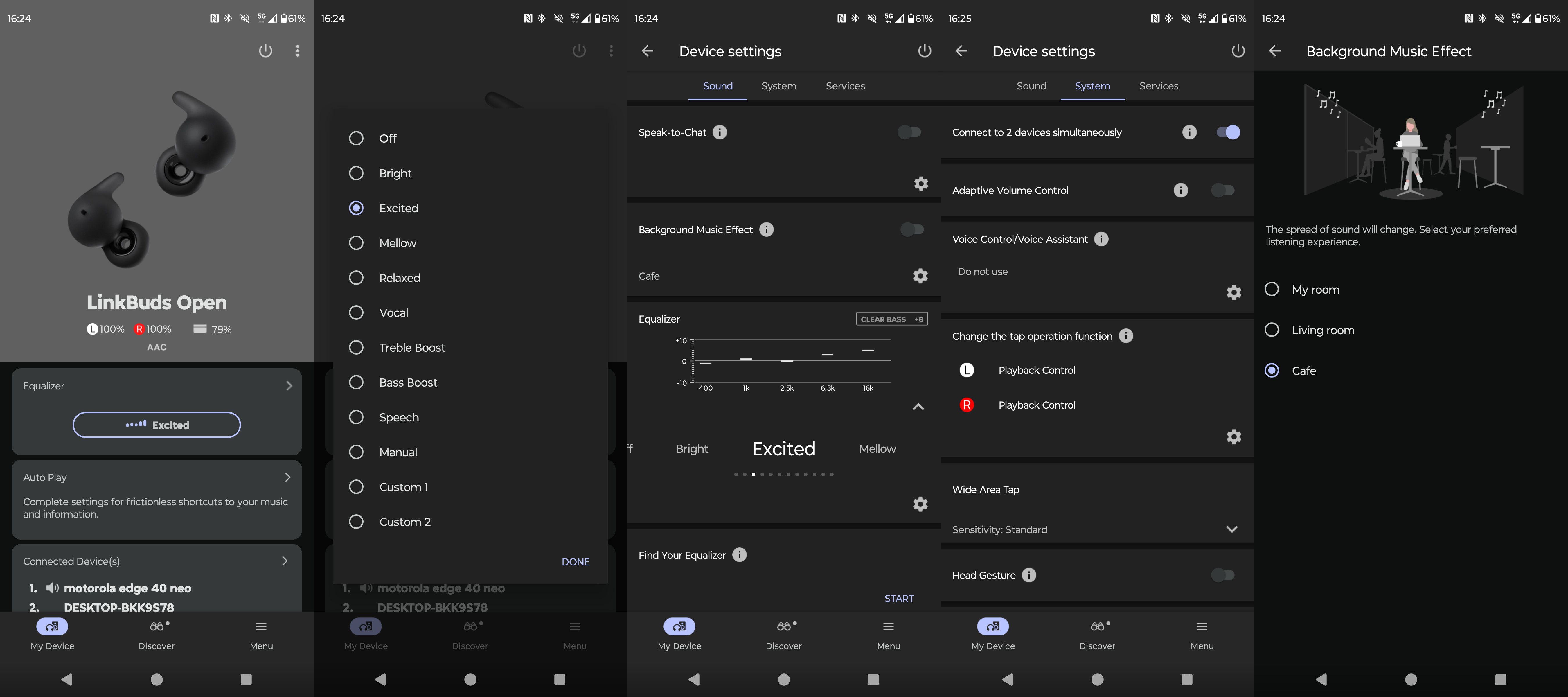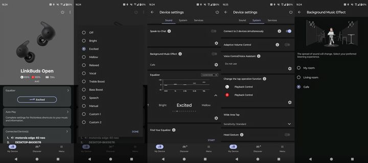 Podstawowe sterowanie słuchawkami jest możliwe bez aplikacji Sound Connect, jednak dopiero w niej uzyskamy pełną kontrolę nad tym, jak działają LinkBuds Open. Aplikacja jest wspólna dla urządzeń Sony, jeżeli więc mamy już inny model, nie powinna nas niczym zaskoczyć.
